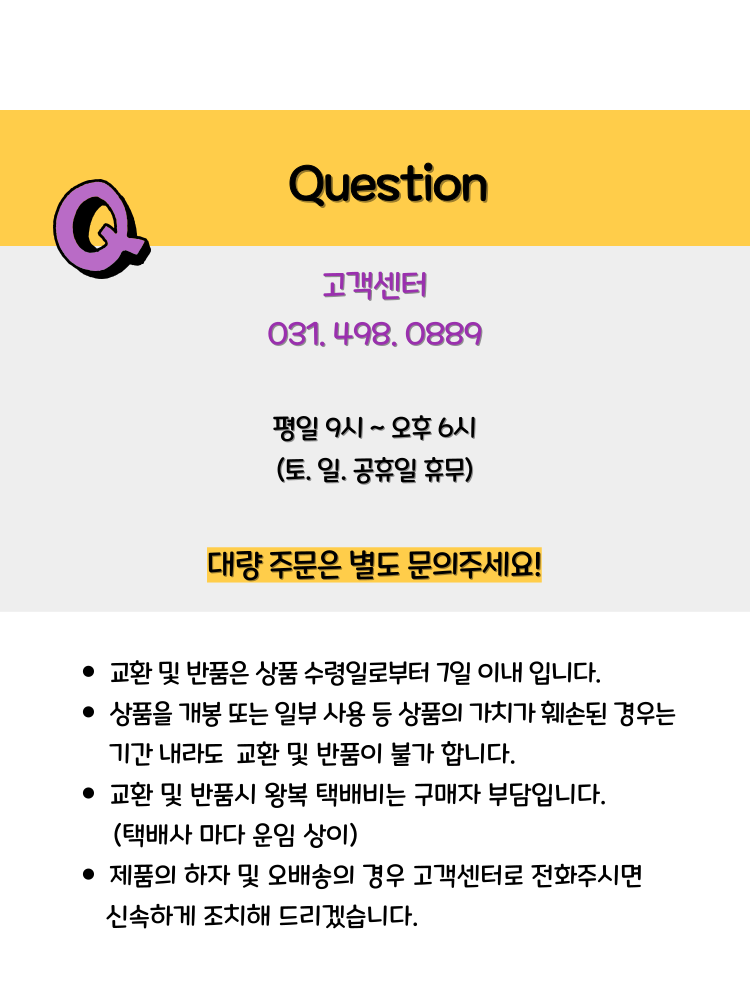 * 상품의 포장용기를 개봉했거나 사용했을 경우, 고객 부주의로 인해 손상 및 파손된 경우, 주문취소가 가능한 경우라도 상품을 받은 신 후 20일이 경과하여 의사를 통보하신 경우 취소가 불가능합니다.